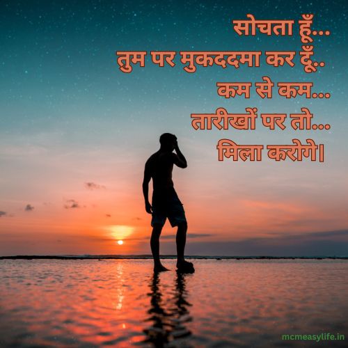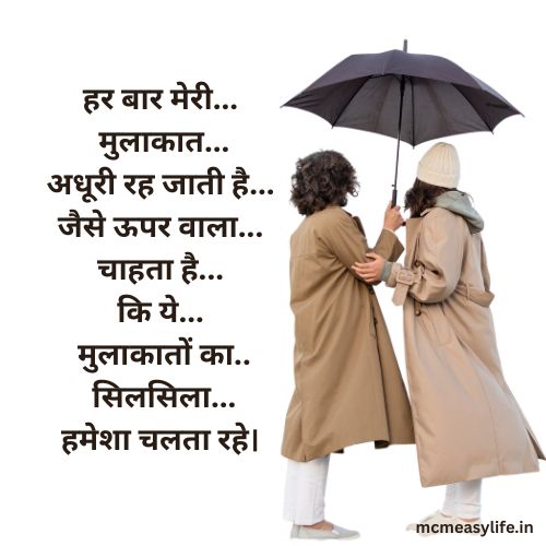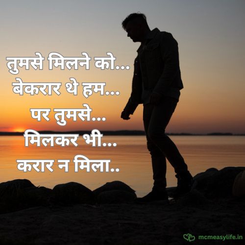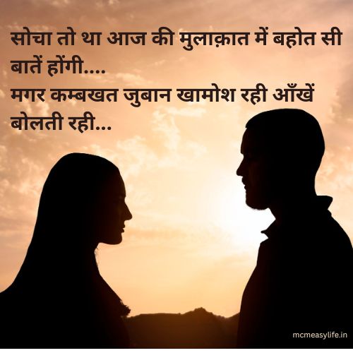 दोस्तों प्यार और जज़्बात की दुनिया में मुलाकात शायरी ( mulakat shayari ) का अपना ही अंदाज़ है। एम् सी एम् इजी लाइफ पर आपको मिलन के हर मौके के लिए बेहतरीन शायरी मिलेगी फिर चाहे वो मिलना शायरी हो , दिल छू लेने वाली हो मुलाकात पर शायरी ( mulakat per shayari ) हो या मोहब्बत से भरी मिलन की शायरी हो आपको हर परिस्थिति के लिए मुलाकात शायरी की रचनाएँ मिलेंगी । यहाँ पहली मुलाकात की धड़कनें हों या बिछड़े पलों के बाद मिलने की खुशी और उम्मीदों से भरी मिलने के लिए शायरी ( milne ki shayari )मौजूद है। अपनी भावनाओं को और गहराई से व्यक्त करने के लिए इन शायरियों का संग्रह आपके लिए खासतौर पर तैयार किया गया है।